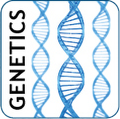 Square graphical button with 3 DNA helixes on it and the word Genetics vertically on the left